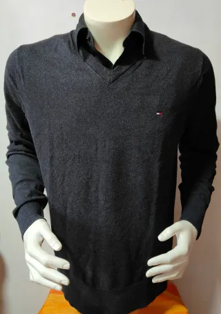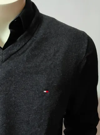 Jersey de punto fino de Tommy Hilfiger, perfecto para un look casual o elegante. - marrón grisáceo. - axila a axila= 58 - Tejido suave de algodón y cachemira. - Diseño de cuello en V. - Pequeño logo de la marca en el pecho.