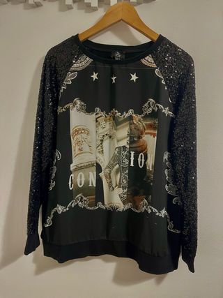 Jersey de algodón con mangas adornadas con lentejuelas. - Diseño frontal con estampado gráfico y dibujos. - Mangas largas con lentejuelas negras. - Cuello redondo y puños elásticos. - Muy original
