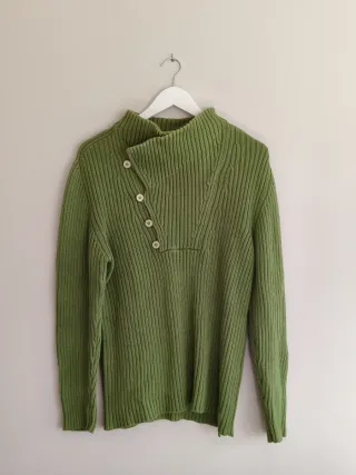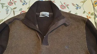 Precio no negociable ‼️ Jersey de punto con diseño de espiga y cuello alto. Usado un par de veces pero está nuevo como el primer día. Se puede ver en el tejido que no tiene bolitas y ningún desperfecto. La etiqueta todavía conserva un botón de repuesto. - Cremallera frontal. - Puños y cuello de canalé. - Detalle de logo bordado en la parte frontal. - Composición: 70% algodón, 25% poliéster y 5% seda. Talla: L Medidas: 44 cm hombro, 54 cm sisa y 62,5 cm largo.