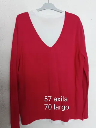 Jersey de punto fino en color rojo tipo quisquilla, entre rojo y rosa vivo. Tacto suave, creo qué es algodón. Usado algunas veces está en buen estado, se descosió un poquito al lado de la etiqueta pero lo cosí, se ve en la última foto, por lo demás está bien. Medidas en las fotos. La camiseta blanca que se ve debajo no está incluida.