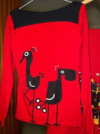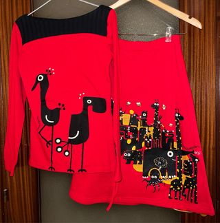Conjunto jersey y falda invierno, de la marca Como Una Regadera, nuevo, nunca estrenado. Talla S, falda más abrigada y de tejido más fuerte en 100% algodón; y el jersey más fino en 90% algodón y 10% elastano. Pongo medidas para orientar: * Medidas jersey: - Largo jersey por delante: 56 cm. - Largo jersey por detrás: 56 cm. - Ancho hombros desde costuras: casi 37 cm. - Ancho entre axilas: 41 cm. - Largo mangas desde hombros: 57 cm. - Largo mangas desde axilas: 45 cm. * Medidas falda: - Largo falda: 62 cm. - Ancho cintura: 33 cm con goma adaptable. - Ancho bajo falda: 64 cm.