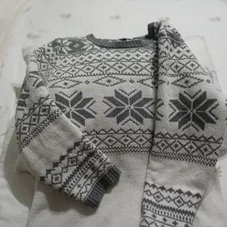 Jersey de punto con estampado invernal. - Diseño con motivos de copos de nieve y patrones geométricos. - Cuello redondo y manga larga. - Tejido suave y cálido.