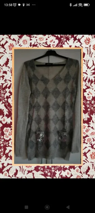 Jersey invierno largo con un diseño de rombos en tonos grises. Presenta dos bolsillos delanteros con detalle de lentejuelas. - Cuello en pico. - Tejido suave y ligero. Es muy bonito porque la lana tiene un poquito de brillo y las lentejuelas de los bolsillos le dan un toque Rombos con dos tonos grises de color 💱 Descuentos por lotes 💱