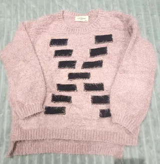 Jersey de punto suave con un diseño moderno. - Tejido mullido y agradable al tacto. - Detalle de parches negros en forma de ladrillo. - Cuello redondo y mangas largas. Jersey o suéter de invierno de mujer en color rosa con detalles en negro. Talla s/m, está como nuevo, usado en muy pocas ocasiones. Es muy calentito Es más largo por detrás que por delante. Ancho de axila a axila 52 cm Largo suéter por delante 54 cm