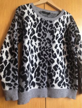 Jersey de punto, grueso y abrigado. Estampado Leopardo en gris, blanco, negro; predomina el color gris. Cuello a la caja y mangas largas. Pone talla S/M, pero bien podría ser un M/L. Mejor para 38/40. No es estrecho. De Sophyline. Composición y medidas en fotos!! Usado pero le queda vida 🌼 👁️ No envío por Correos España ❌ ENVÍOS RÁPIDOS POR INPOST o GLS