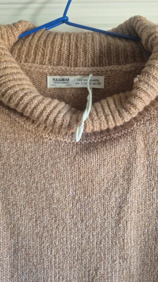 Jersey de punto de cuello alto de la marca Pull&Bear. - Tejido suave y cálido. - Diseño de punto grueso. - Cuello alto acanalado. Vestido/jersey de punto largo de la marca Pull&Bear, talla S. Diseño oversize con cuello vuelto, hombros caídos y tejido grueso ideal para otoño/invierno. Color: camel / beige Estado: excelente estado. Origen: Pull&Bear (etiqueta visible). Medidas: Largo desde hombro: 56 cm Altura : yo mido 1.69 ( si mides desde el.cuello hasta el.final hay 72cm) y me quedó muy justo prácticamente solo me cubre el trasero entonces es mejor si lo usa alguien con menos altura.