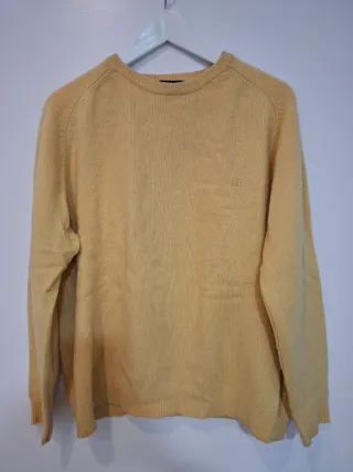 Jersey de hombre Pedro del Hierro, cuello caja, en tono amarillo claro / vainilla, suave y elegante. Confeccionado en cashmere blend, con buen tacto y acabado cuidado. Color distinto pero muy combinable, ideal para dar luz a looks de invierno. 📏 Talla: etiqueta L, pero talla más bien M (ajuste algo justo). 🧥 Estado: muy bueno, con ligero uso. 🔎 Precio original: 95 €. Vendo por rotación de armario. Acepto ofertas razonables.