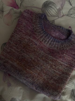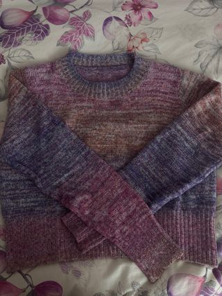 Jersey de punto con un diseño multicolor vibrante, ideal para la temporada de invierno. Su tejido suave y cálido te mantendrá cómoda. - Diseño jaspeado con tonos rosas y morados. - Cuello redondo. - Manga larga.