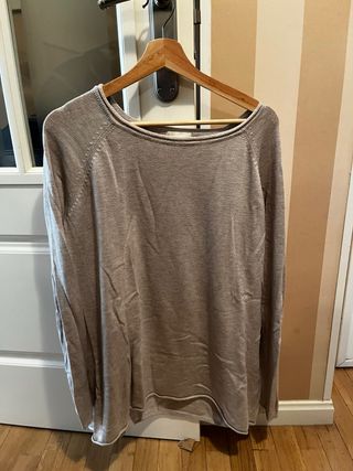 Jersey de punto en color beige, con un diseño versátil. Es una talla grande y lo utilizo como vestido con legging - Tejido suave y cómodo. - Manga larga. - Cuello redondo.