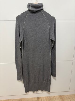 Vestido de punto gris con cuello alto y detalles de ribetes. - Diseño de cuello alto. - Ribetes contrastantes en las costuras. - Largo hasta la rodilla. - Tejido de punto suave.