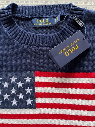 Vendo este jersey de Polo Ralph Lauren en color azul marino, con la clásica bandera de Estados Unidos tejida en la parte frontal y las iniciales RL bordadas. La prenda está nueva con etiqueta, tal como se ve en la foto. Talla: L Estado: Nuevo a estrenar Diseño icónico: bandera tejida con gran detalle Calidad premium: punto grueso, suave y resistente Estilo clásico RL, perfecto para looks casuales o más cuidados Ideal para otoño e invierno Envío rápido y bien protegido. Si quieres más info escríbeme