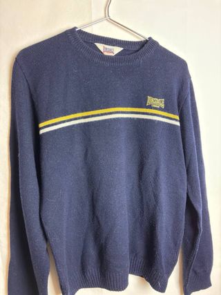 Jersey de punto azul marino con detalles de rayas. - Logo de Lonsdale bordado en el pecho. - Diseño clásico con cuello redondo. - Ribetes en puños y bajo.