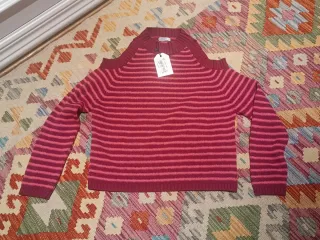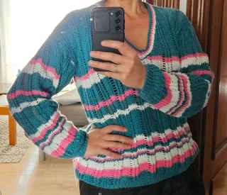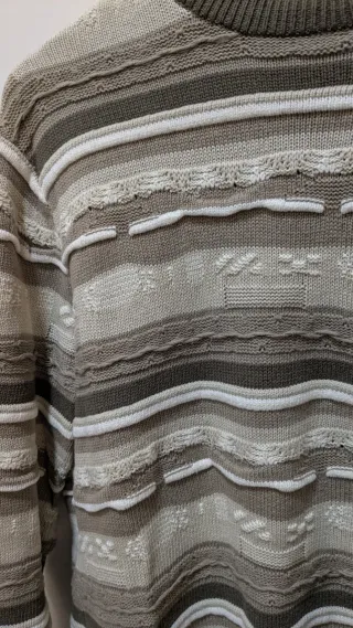 Jersey de punto con diseño de rayas horizontales en tres colores.Se ha usado pero esta bien conservado. Talla xl. La parte de abajo no lleva goma queda suelto. Se puede ver sin ningún compromiso. Más cosas en mi perfil y más sueters, pantalones, chaquetas, sudaderas - Cuello redondo. - Manga larga. - Tejido texturizado.