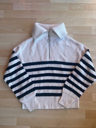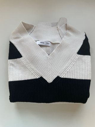 Jersey de punto con diseño de rayas. Aunque no lo parezca es una talla s, es bastante ancho y cómodo, perfecto para invierno ☃️🤍 - Cuello en pico. - Manga larga. - Tejido de canalé.