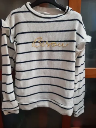 Jersey de punto con un diseño de rayas horizontales en tonos azules y blancos. El cuello es redondo y el tejido es suave. Poco uso.