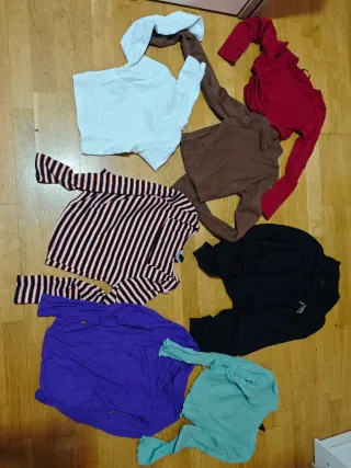 siete jerseys/camisetas de manga larga, algunos estilo crop top, talla S. Precio individual. - Jersey blanco con textura. - Jersey marrón de cuello alto. - Jersey granate de cuello alto. - Jersey de rayas blancas, negras y rojas. - Jersey negro. - jersey morada. - Jersey verde menta. (Talla XS)