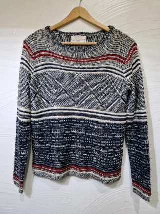 Jersey de punto con un diseño geométrico y rayas. Jersey de colores. Acrílico, poliéster y algodón - Cuello redondo. - Manga larga. - Azul, rojo, blanco y tiene pequeñas lentejuelas. Medidas: ancho de Hombros 41 cm Sisa 45 cm Largo 56 cm