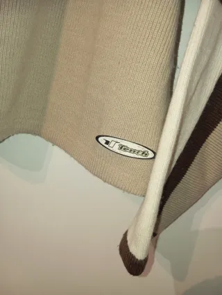 Jersey de punto con un diseño de rayas texturizadas en tonos beige y marrón. - Cuello redondo. - Manga larga. - Tejido de punto con relieve. - 100% algodón - Prácticamente nuevo.