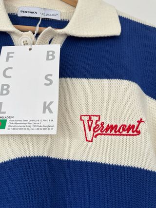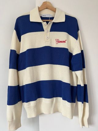 Jersey de punto con rayas horizontales en azul y beige. Presenta un cuello tipo polo con botones y un bordado de Vermont en el pecho. - Diseño de rayas. - Cuello polo con botones. - Bordado Vermont en el pecho.