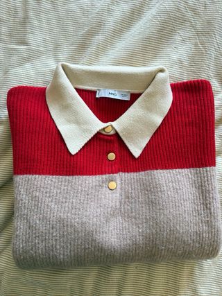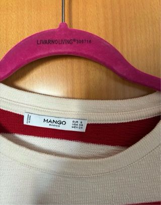 Jersey de Mango con un diseño de rayas clásico. Es una prenda cómoda y versátil. - Diseño de rayas rojas y blancas. - Manga larga. - Cuello redondo.