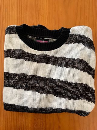 Jersey de estilo vintage oversize con un diseño de rayas y unos sutiles brillos en las rayas negras. Estilo y elegancia. En perfecto estado. - Cuello redondo. - Manga larga. - Puños y bajo de canalé.