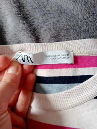 Jersey blanco de punto con rayas de colores azul y rojo y cuello redondo de Zara. Talla M. Nueva con etiquetas, a estrenar.