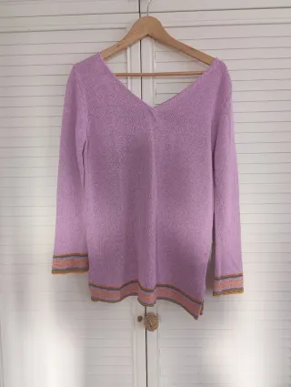Jersey de manga larga con cuello de polo y un diseño de rayas brillantes. El tejido es ligero y cómodo. - Diseño de rayas multicolor. - Cuello de polo con escote en V. - Tejido con hilo brillante. - Se ha puesto dos veces solos. - talla como una M