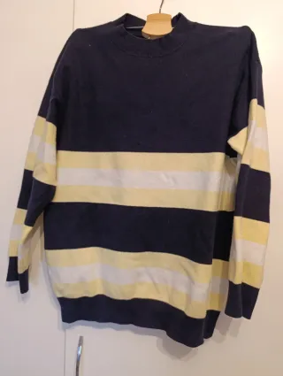 Jersey de punto con un diseño de rayas clásico. Es una prenda cómoda y versátil. - Tejido de punto con textura. - Diseño de rayas horizontales. - Cuello redondo. Es talla M pero es amplio. Si usas L es posible que tambien te valga