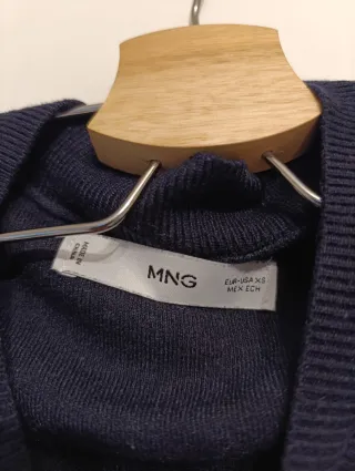 Jersey de Mango con un diseño de rayas en tonos azulados y grises. Es una prenda de punto abierta, ideal para añadir un toque de color a tus outfits. - Diseño de rayas horizontales. - Manga larga. - Cuello redondo. Jersey Mango rayas azules y grises, con hilo plateado brillante. Hecho a mano. Elegante. Poco usado, en perfecto estado. #jersey #Mango #rayas #azul #gris #hilo #plata.