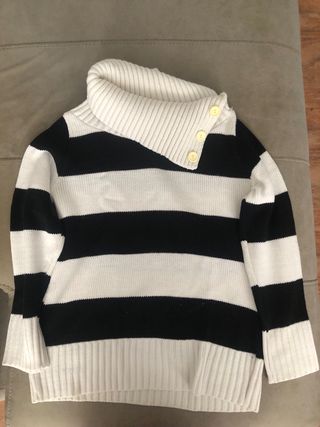Jersey de rayas finas en negro y blanco. Tiene un diseño de cuello barco. Es larguito. Cualquier duda preguntar. Envío como más convenga al comprador.