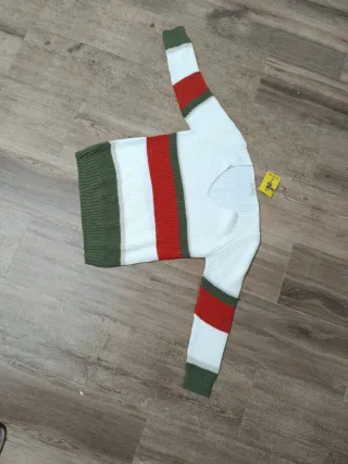 Jersey de señora con un diseño moderno y cómodo. - Corte oversize y escote en pico. - Combinación de rayas en verde, rojo y blanco. - Sin estrenar, con etiqueta.