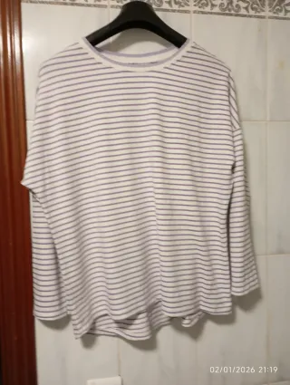 Jersey de manga larga con un diseño de rayas finas. -Medidas de axila a axila 64 y largo 73/68. -Es más largo por detrás que por delante. - Diseño de rayas horizontales. - Cuello redondo.