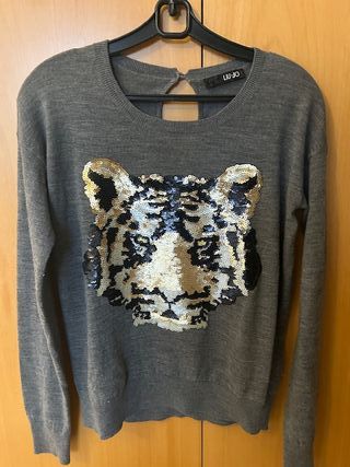 Jersey de punto gris con un llamativo diseño de tigre en lentejuelas doradas y blancas. - Manga larga. - Cuello redondo. - Diseño de tigre con lentejuelas.