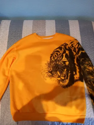 Jersey de manga larga con un llamativo diseño de tigre en la parte delantera. - Estampado de tigre en color naranja. - Cuello redondo. Da mucha talla, mangas ajustadas, es fino, cuello redondo. Combinación de colores muy bonita.