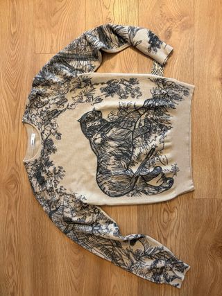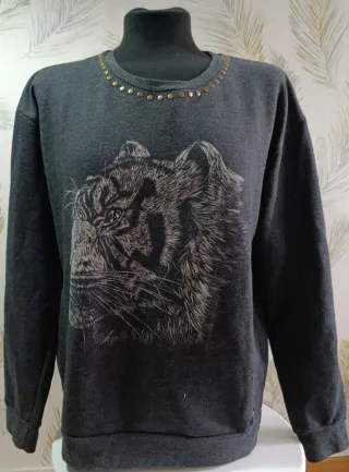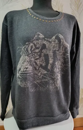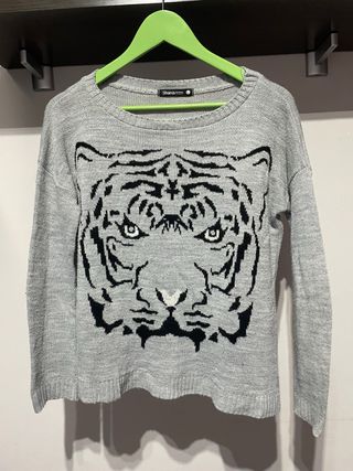Jersey de manga larga en color gris con un llamativo estampado de tigre en la parte delantera. - Diseño de cuello redondo. - Tejido de punto suave. - En muy buen estado.