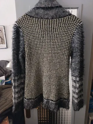 Jersey de punto fino con un diseño original y moderno. Impecable con tan solo una puesta. Precioso, original y de gran calidad. Lleva como forro simulando una blusa debajo en el cuerpo; en las mangas no lo lleva. Bonita caída, suave y cómodo. Es una M pero podría valer también para una talla L. No obstante tienes las medidas para que puedas asegurarte. De hombros mide 38cm, de axila a axila mide 45cm y de largo 67cm. Precio cerrado; comprado hace 2 temporadas