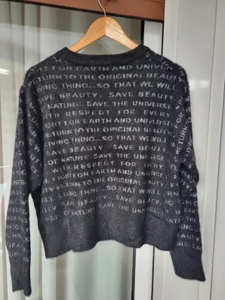 Jersey de punto negro con un llamativo logo de la marca en la parte delantera. Es Talla S pero da hasta una M. - Diseño con letras estilizadas. - Cuello redondo. - Manga larga.