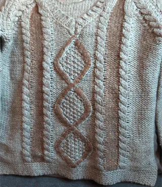 Jersey de punto con diseño trenzado y detalles en relieve. Cuello en pico y manga larga. Jersey mujer talla S de la marca Desigual color beige con marrón precioso y calentito usado contadas las veces que se ha usado está en muy buenas condiciones cómo veis en las fotografías que también forman parte de la descripción - Diseño con trenzas. - Detalles en relieve.