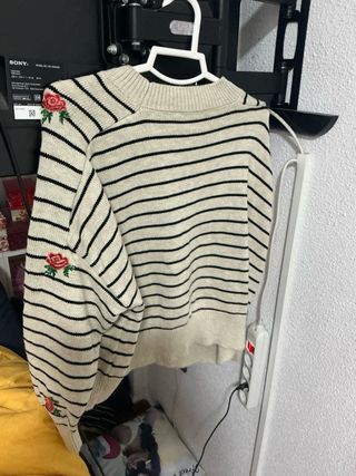 Jersey de punto con rayas horizontales y un diseño de rosas bordadas. - Diseño de rayas blancas y negras. - Detalle de rosas rojas bordadas. - Manga larga.