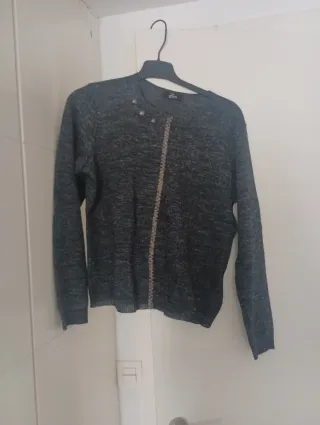 Jersey de punto fino con un diseño de calados en forma de V y detalles de lentejuelas. Manga tipo murciélago, sin cortes. Es un color gris puro como se ve en las dos primeras fotos. El resto se ven muy claras por la luz. Medidas sobre superficie plana: Largo desde el hombro 75 cm; cintura 43 cm; largo manga desde el cuello 66 cm; ancho bajo 40 cm. creo que da más talla. Tengo una 40- 42 con mucho pecho y me vale perfectamente. queda ajustado a la cadera. - Manga larga. - Cuello redondo. - Bajo y puños de canalés