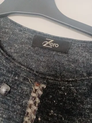 Jersey de punto fino para mujer de la marca Zero. Presenta un diseño con detalles decorativos en la parte frontal. - Manga larga. - Cuello redondo. - Adorno central con hilo plateado y botones pequeños.