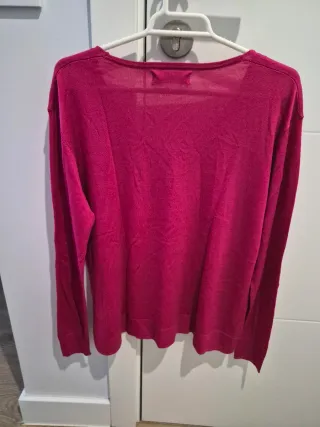 Jersey de lana, fino, con unas mangas muy originales, pegadas al brazo del hombro al codo y el resto de manga, afarolada, como un tulipán. Da bastante talla, marca una L pero es más una XL.