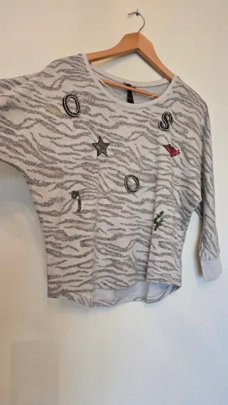 Jersey fino con un original estampado de cebra y detalles que le dan un toque único. - Diseño con apliques de estrellas, labios, letras y abalorios. - Tejido ligero y cómodo. - Suelto en pecho y ajusta un poco en Cadera. - Pone S pero da más talla. Medidas cadera: 49