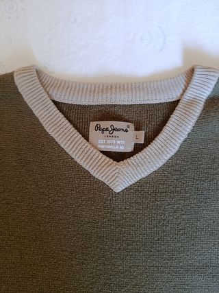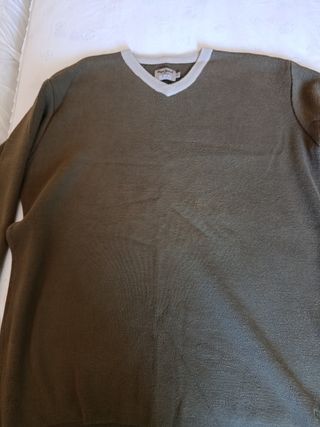 Jersey de punto fino con cuello en V y coderas. Composición 100% algodón. Tengo más modelos en mi perfil, se puede hacer lote y precio. - Color verde oliva. - Logo discreto en el pecho.