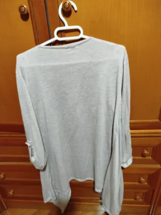 Preciosa camiseta de punto fino, color beige claro. Es de manga tres cuartos y tiene cuello camisero. Está en muy buen estado, apenas se ha usado. - Tejido suave y ligero. - Cierre de botones. - Ideal para entretiempo.