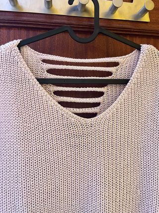 Jersey de punto fino con escote en pico y detalles calados. Medidas: 49 cm de hombros y 55 cm de largo. - Diseño en V con calados. - Manga larga. - Tejido suave y ligero.