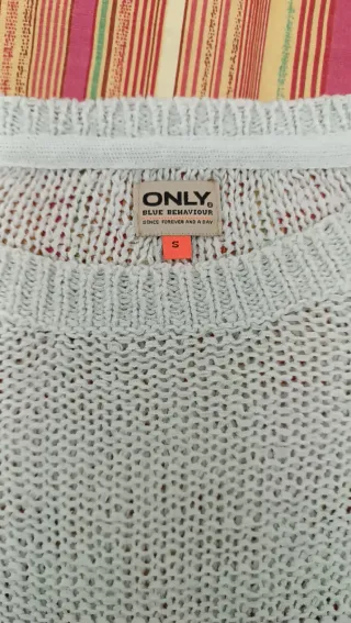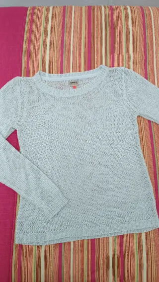 Jersey de punto fino con un diseño calado muy bonito. - Manga larga. - Cuello redondo. - Tejido suave y ligero. Lleva entrelazado un hilo de plata que en algunos puntos da brillo, pero no se aprecia en las fotos
