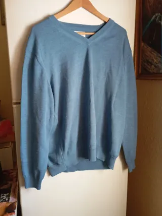 Jersey de punto fino en color azul cielo. Tiene un cuello en pico y mangas largas. - Tejido suave y ligero. - Diseño de canalé. - Calientito.