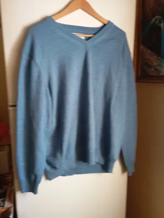 Jersey de punto fino en color azul, con cuello redondo y manga larga. - Diseño con cuello redondo. - Manga larga raglán. - Tejido de punto fino. En muy buen estado. Poco uso. Ideal para esta primavera. Medidas hombros 54 cm. De axila a axila 56 cm. Y de largo 72 cm.