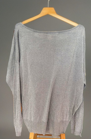 Jersey de punto fino con un diseño elegante y moderno. - Talla grande. - Tejido suave y confortable. - Detalles brillantes plateados integrados en el tejido. - Cuello redondo y manga larga.